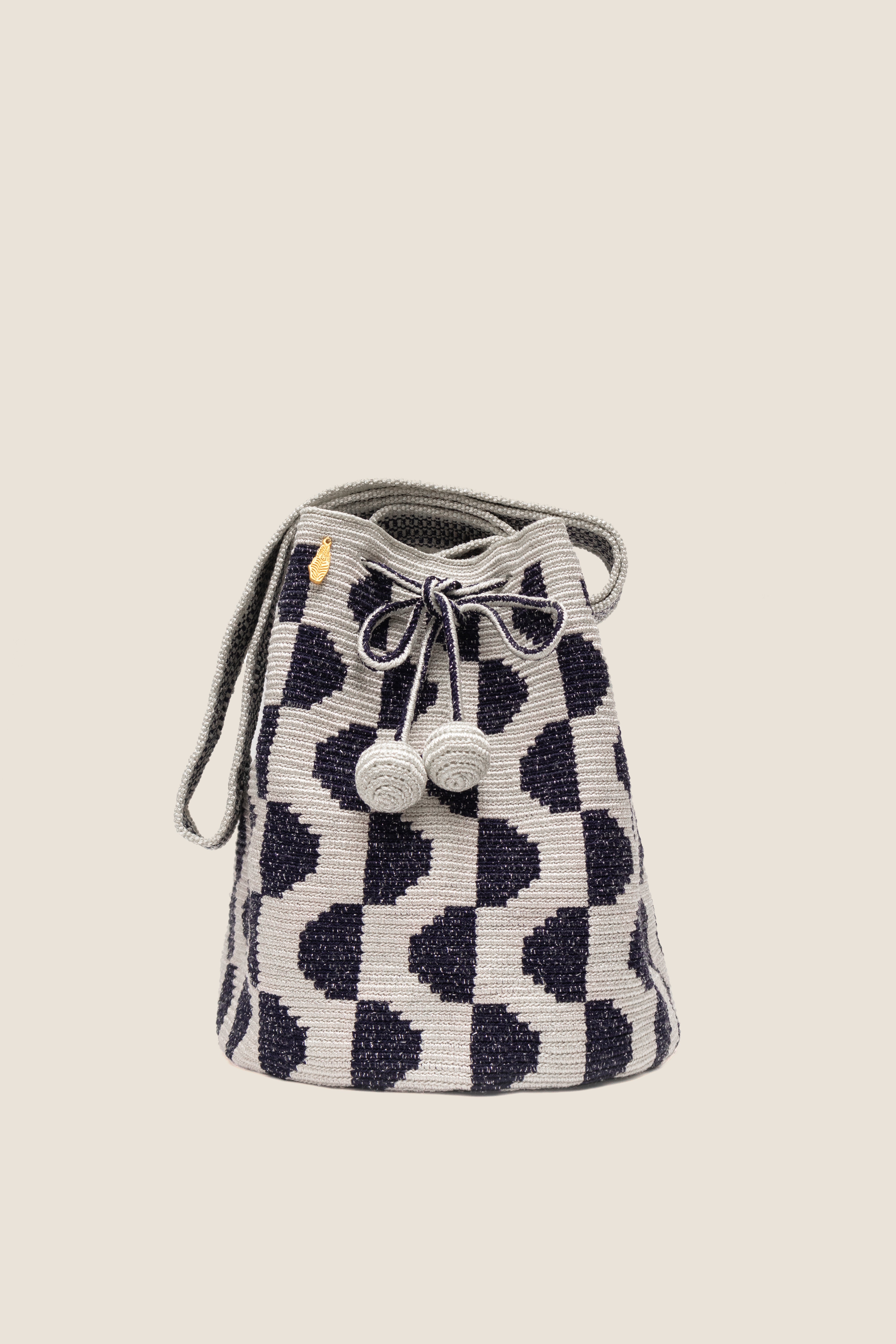 Una reinterpretación de la tradicional mochila Wayuu, elaborada con hilos de seda. Su diseño presenta fases lunares y formas circulares que simbolizan los ciclos femeninos. Ligera, cómoda y profundamente simbólica.