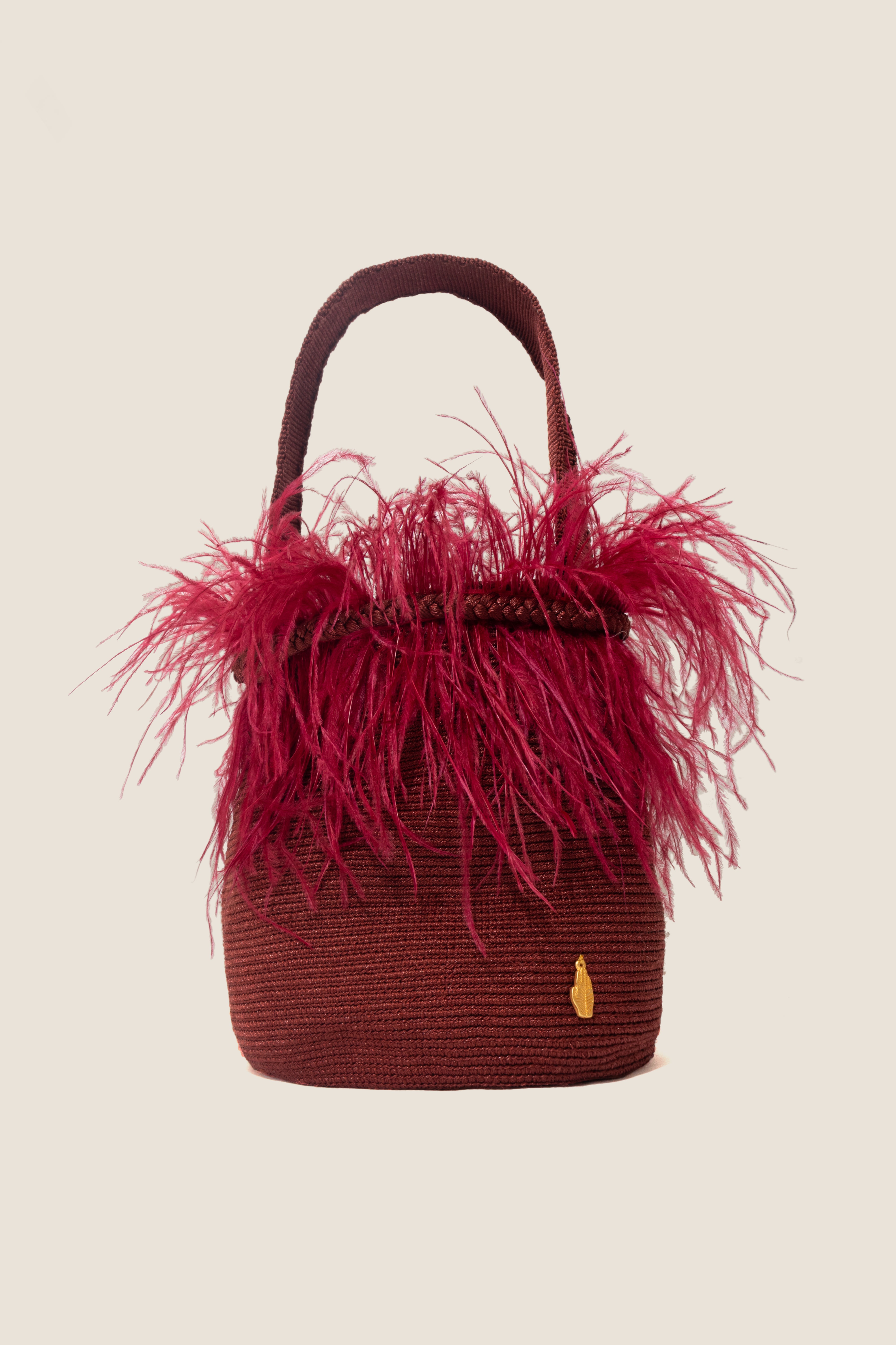 Versión cilíndrica del bolso Amour. Tejido a mano con detalles de plumas y acabados finos. Llamativo pero versátil: ideal para elevar cualquier look con identidad y sofisticación.