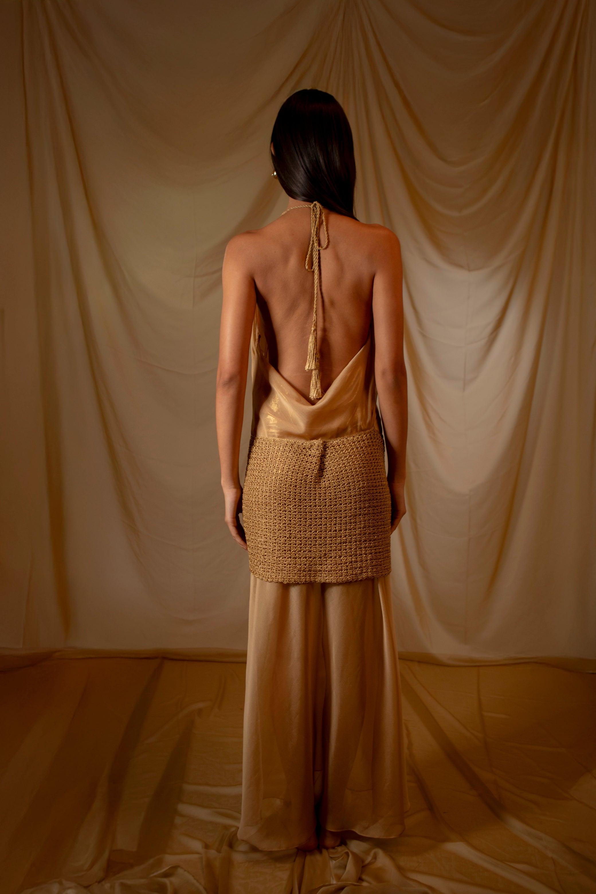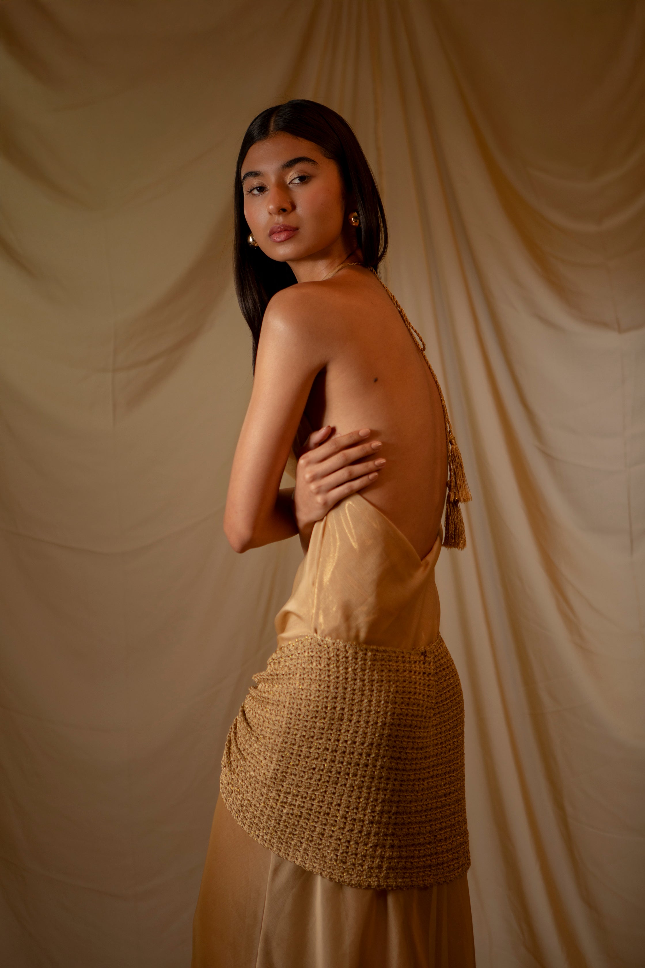 Vestido largo,diseño con escote de caída fluida y espalda descubierta,